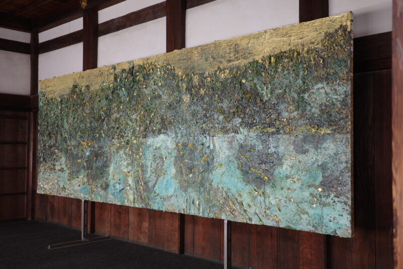 280×470cmの混合メディア絵画。乳剤、油彩、アクリル、シェラック・ニス、金箔、電気分解生成物、石膏、木、スチール、皮革、チャコールを重ね、北極で輝くオーロラの幻想的な色彩と変化を表現します 。